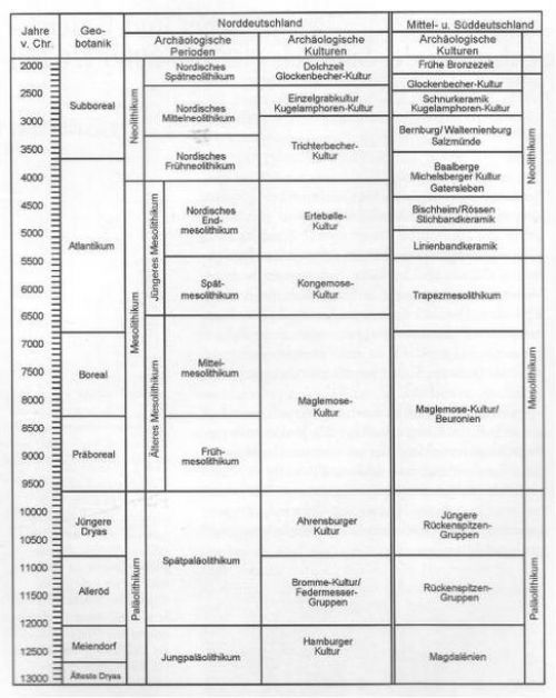 Diese Menschen gehörten zur so genannten Hamburger Kultur, die wie viele andere Kulturgruppen nach dem Ort benannt ist, an dem deren Fundstätten erstmals nachgewiesen wurden. Aus dem Raum zwischen Elbe und Oder sind bislang nur wenige Einzelfunde dieser Rentierjägerkultur bekannt. Die vollständige Wiederbesiedelung des Landes setzte erst ab 12.000 v. Chr. im Alleröd-Interstadial ein, als durch ein zunehmend feuchteres Klima die trockene, mit Zwergbirken bestandene Tundra durch Kiefern-Birkenwälder verdrängt wurde. Durch die veränderten Umweltbedingungen mussten auch die Menschen ihr Jagdverhalten ändern und sich auf das Erlegen des im Wald lebenden Standwildes wie Wisent, Ur, Elch oder Rothirsch spezialisieren. Aber auch der wenig später ausgestorbene Riesenhirsch wurde noch von ihnen gejagt. Als Jagdwaffen kamen sowohl Speer als auch Pfeil und Bogen zum Einsatz. Diese Menschen gehörten zu zwei verschiedenen Kulturgruppen, deren Verbreitungsgebiete sich in Norddeutschland überschneiden. Die nach einer typischen Pfeilspitzenform benannten Federmessergruppen waren mehr südlich verbreitet, während die zu den Stielspitzengruppen zählende Bromme-Kultur vor allem im heutigen Südskandinavien vorkam. Um 10.800 v. Chr. kam es zunächst noch einmal zu einem heftigen Kälterückschlag, der Jüngeren Dryas, die in Norddeutschland zu einer erneuten Ausbreitung einer Tundrenlandschaft und zur Rückkehr der Rentierherden führte. Die Rentierjäger dieser Zeit gehörten zur Ahrensburger Kultur, die aufgrund charakteristischer Pfeilspitzenformen zu den Stielspitzengruppen gezählt wird.