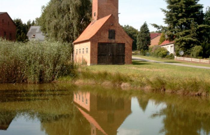 Idyllisch spiegelt sich das alte Feuerwehrgerätehaus auf dem der Wasserfläche wieder.