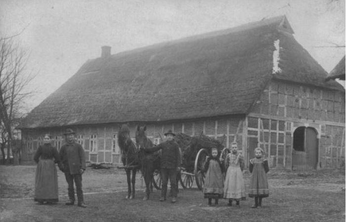 Das Foto zeigt ein altes Vierständer-Hallenhaus in Middefeitz, das mittlerweile durch ein den neuzeitlichen Wirtschaftsbedürfnissen angepasstes Gebäude ersetzt wurde