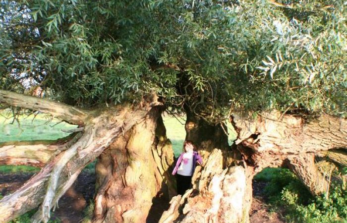 Die alte Kopfweide hat einen Stammumfang von gut 10 Metern. Verbarg sich hier im hohlen Stamm der letzte Überlebende bei dem Übergriff auf das Dorf im dreißigjährigen Krieg?