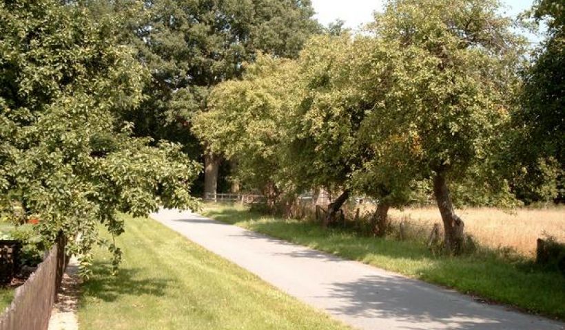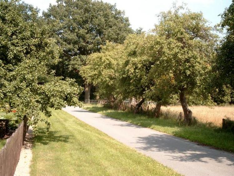Ein mit Apfelbäumen gesäumter Weg innerhalb der Ortslage