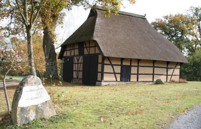 Der reetgedeckte Schafstall, im Vordergrund ein alter Wegweiser