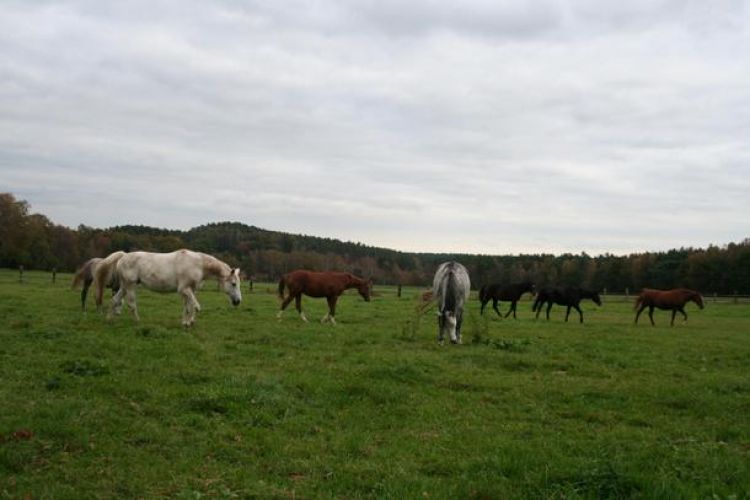 Pferdeweiden werden von den Wäldern umrahmt und zeugen von dem hügeligen Landschaftsbild.